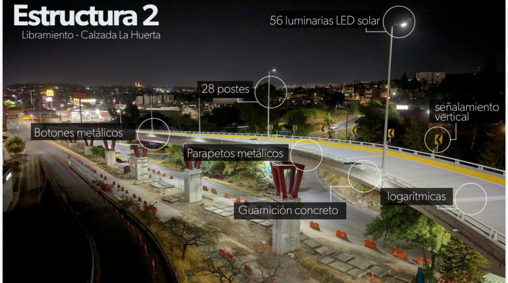 Mientras que el secretario de Comunicaciones y Obras Públicas, Rogelio Zarazúa Sánchez, refirió que en esta primera gaza se colocaron 28 postes, 56 luminarias, parapetos metálicos, botones metálicos y una guarnición de concreto.